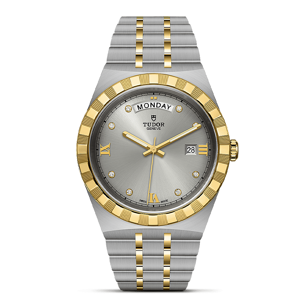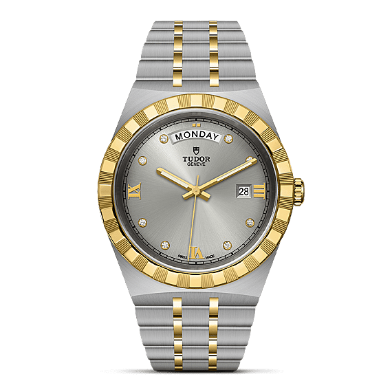 Met zijn geïntegreerde metalen armband, gekartelde of met diamanten bezette lunette en automatisch uurwerk is de TUDOR Royal-serie het toonbeeld van veelzijdige en betaalbare sportieve chic. Voor een laatste vleugje elegantie heeft TUDOR Romeinse cijfers als uurmarkeringen toegevoegd aan de TUDOR Royal-horloges. Alle wijzerplaten zijn voorzien van deze Romeinse cijfers of een combinatie van Romeinse cijfers en acht met diamanten bezette uurmarkeringen.